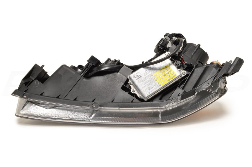 These genuine OEM Mitsubishi Evo 9 HID USDM head lamp housings have the amber along the top with a shiny smoked silver chrome interior housing and fog lights. This part number does include the bulbs, harnesses and HID ballast module as pictured